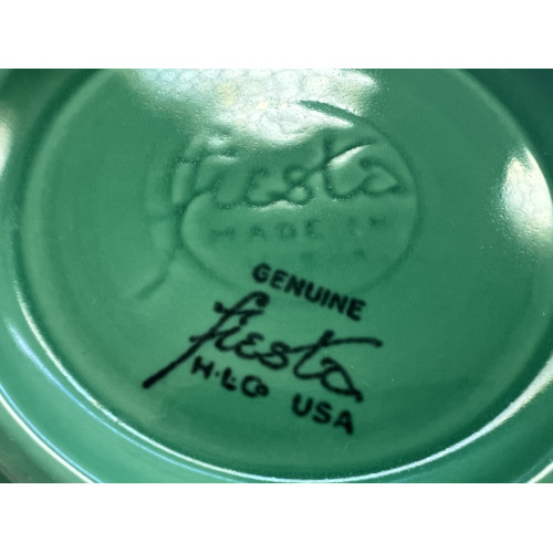 Circa 1936-1946: The larger vegetable bowl was designed after the smaller version and is over 30% larger. Manufactured for 10 years in the Green colored glaze, bowls will be fully glazed on the bottom and marked with the Homer Laughlin logo "HL" followed by "fiesta MADE IN U.S.A.".