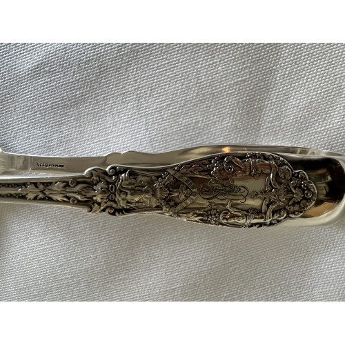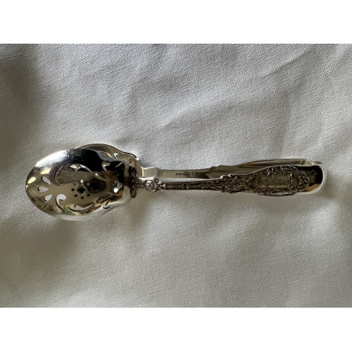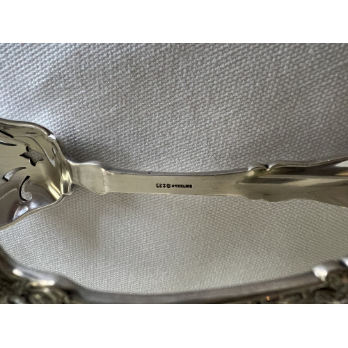 These pierced tongs are in very nice estate condition. They are marked with the Gorham trademark (lion, anchor, G ) and STERLING. This is an obsolete Gorham pattern. c. 1913